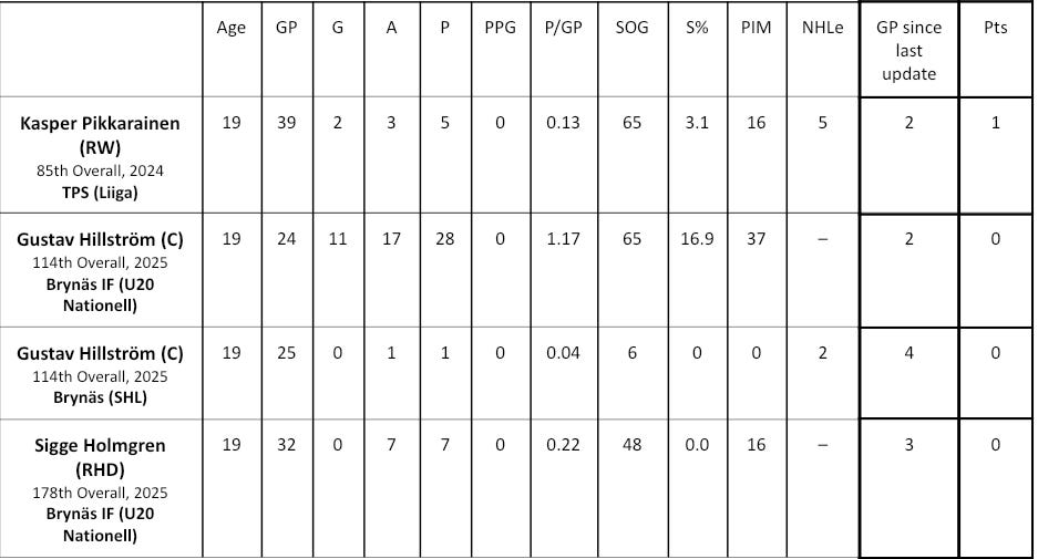 Gustav Hillström maintains the only other European prospect worth monitoring, and even he is having a strange second half of his season. He split time between the SHL and U20 Nationell, but only actually played in two games (logging less than 10 minutes in each) in the SHL. I’m not taking a whole lot of stock in his end-of-year statistics, simply because he’s getting jostled around quite a bit at the moment. He should be a full-time SHLer next season.