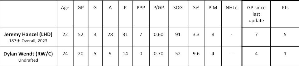 As mentioned above, Wendt was relegated to the ECHL, where he has since put up one goal in four games. He and Jeremy Hanzel are unlikely to do anything meaningful past being bottom-six/bottom-pair guys in the AHL, in my estimations.