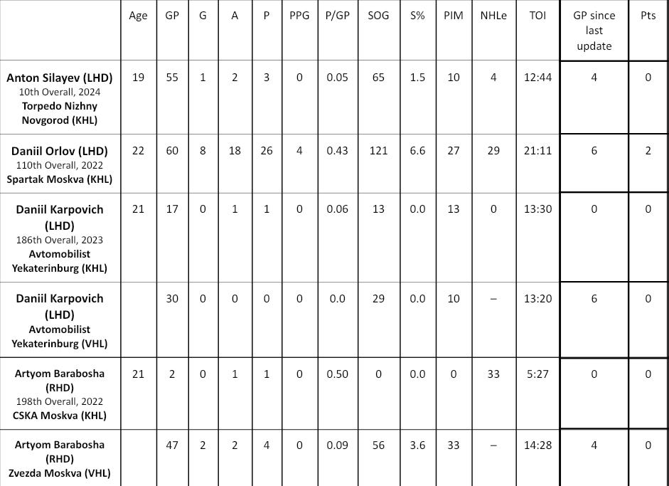 Another two weeks, another point-less stretch for Anton Silayev, who has seen his ice time diminish consistently as well. It’s whatever at this point — there are only a handful of games left in the KHL regular season, and his team is firmly in a playoff spot. It’ll be intriguing to see if he gets increased playing time in the post-season. It’ll be even more intriguing next season, when he’s likely in the AHL.
