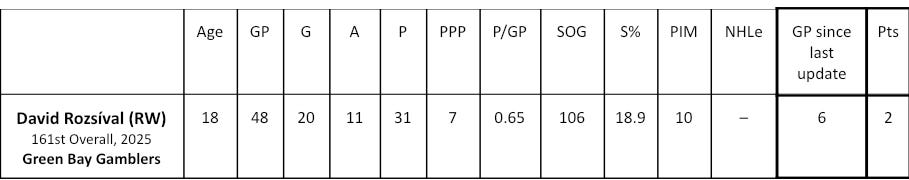 David Rozsíval had a strong couple-week stretch in the USHL where he looked like the Gamblers’ best skater, and, though the production has certainly dipped, I’m not wholly convinced that that stretch was a fluke. His puck protection skills are impeccable — at least at this level — and he is able to pick corners with some regularity from mid-to-short distance. I think he’s going to be one of the better producers in the USHL next season.