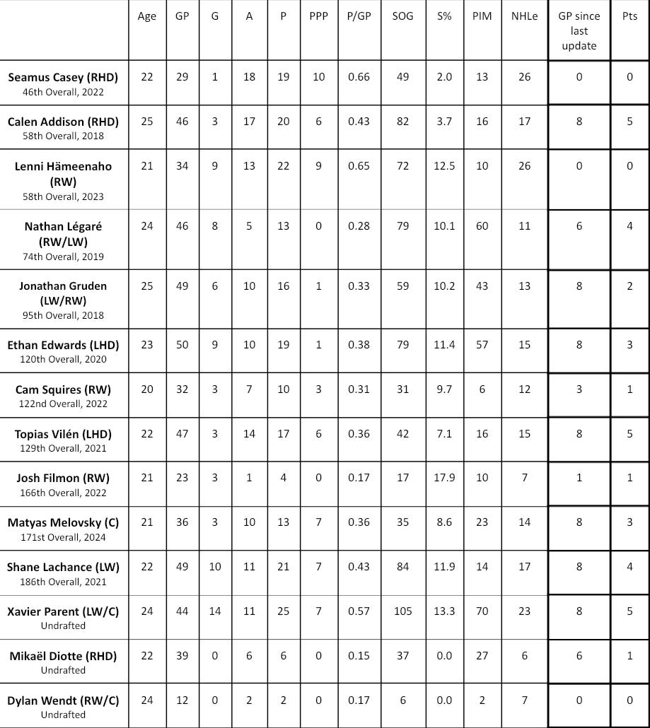 The Comets’ defensemen have done well in the last couple of weeks, in particular, Topias Vilén and Calen Addison, both of whom accrued five points in their last eight games. With Casey out indefinitely, they’ve been the two to step up majorly in an offensive sense, taking on power play responsibilities acting as the primary puck-moving pair together. I’ve gradually lowered my liking of Vilén over the years, but he has previously been a productive player and I could see him turning into a seventh-defenseman in the NHL. As for Addison, he’s been a player in the big leagues before, but I’m not sure he’ll be anything but a call-up in the future.